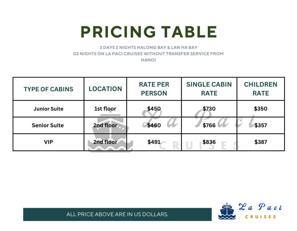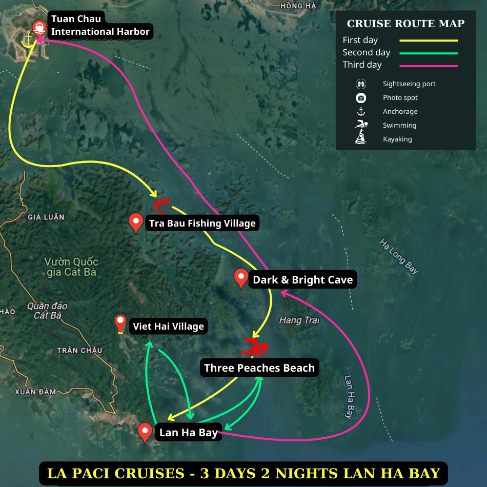 Experience the ultimate getaway with La Paci Cruises on our 3-day, 2-night tour through the breathtaking Lan Ha Bay. Begin your journey with a warm welcome and a refreshing drink as you settle into your spacious cabin. Enjoy a gourmet lunch while cruising past stunning karst landscapes. Your adventure includes swimming and sunbathing at secluded beaches, kayaking through hidden lagoons, and exploring mysterious caves by bamboo boat.